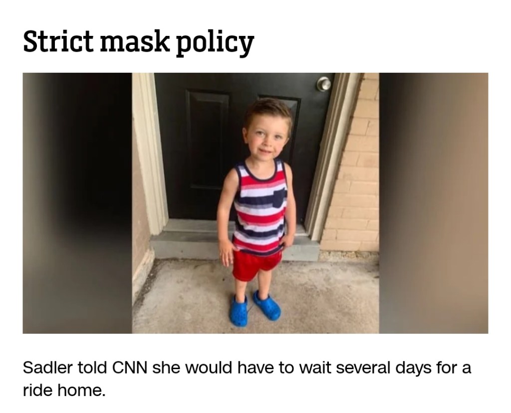 This past week Southwest Airlines removed a passenger and her 3-year-old son from a Monday flight after the boy, who has autism, refused to wear a face mask and became upset. Passenger Alyssa Sadler, who was also traveling with her 1-year-old daughter, told CNN affiliate KPRC that the family was deplaned from the Southwest flight from Midland, Texas, to Houston, Texas. “It was just not a good morning,” said Sadler. “He was screaming. He was throwing a fit. He was screaming no, no, no.”Sadler told KPRC her son has a sensory processing disorder and doesn’t like his face being touched and that she had a medical note explaining the condition. (cnntravel)