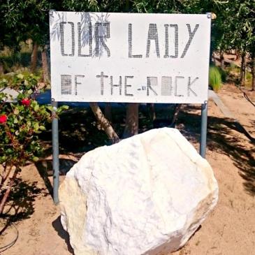 The correct way is the side that has a small white makeshift sign that says LINCOLN in red writing and a very small white handmade sign in white the says in black writing OUR LADY OF THE ROCK. These signs are faint, washed out, on a high power pole and you can easily miss them. Once you find the right direction going left on Lincoln then go up the dirt road hill until you come to the Eileen Blvd intersection. You will see the small church in the distance from this intersection. There will be a small white dome in the distance with small blue flags blowing in the wind marking the courtyard of the outdoor church ceremony. You park on the outside of the fence surround the church. It really is an all day affair so be prepared for the timing which is very nondescript. Also, this is a Spanish speaking religious ceremony for mainly Mexican patrons. The service is given in Spanish by the Spanish Catholic Nuns, a Catholic Priest, Spanish religious singing Mariachi style singers and mainly all Spanish speaking Mexican patrons. So bring a Spanish speaker with you or otherwise enjoy the beautiful ceremony but you won’t understand anything being said there.